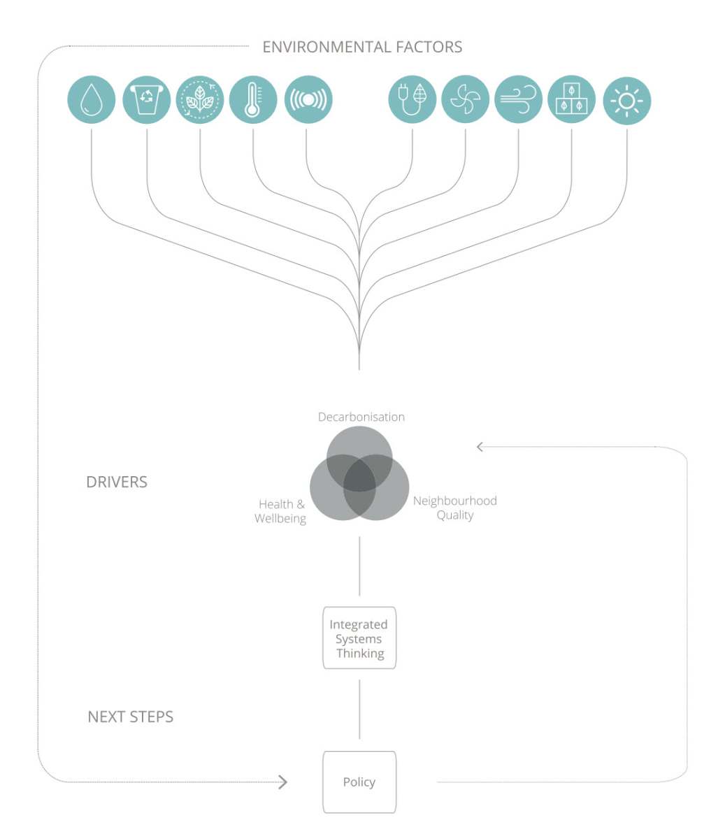 Ten environmental factors were identified and interrogated that were considered those that have the greatest effect on both the macro and micro scales: the neighbourhood and the planet. The report describes their impact and mitigation and highlights the inherent tensions or trade-offs that may result in the need to make challenging decisions.